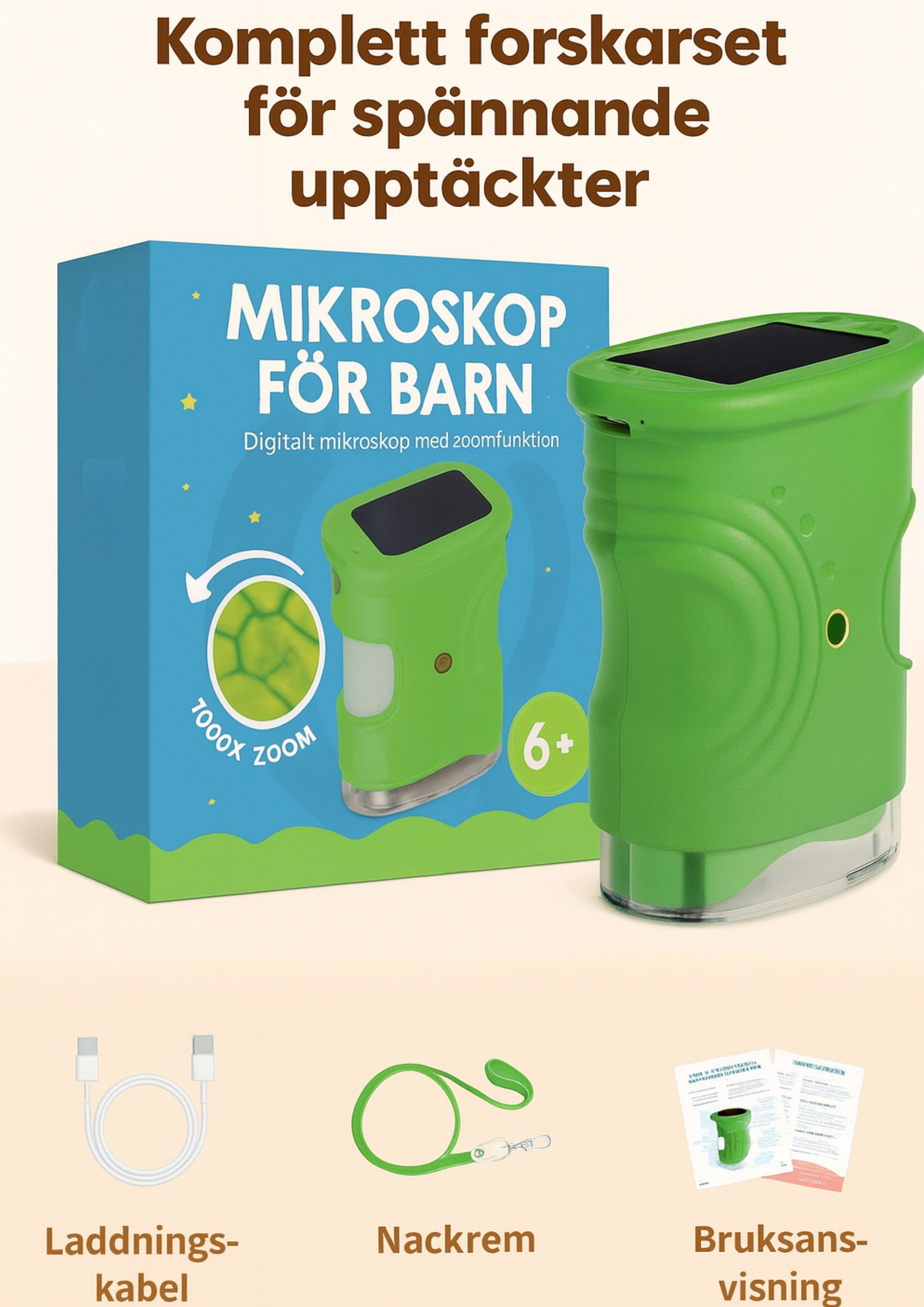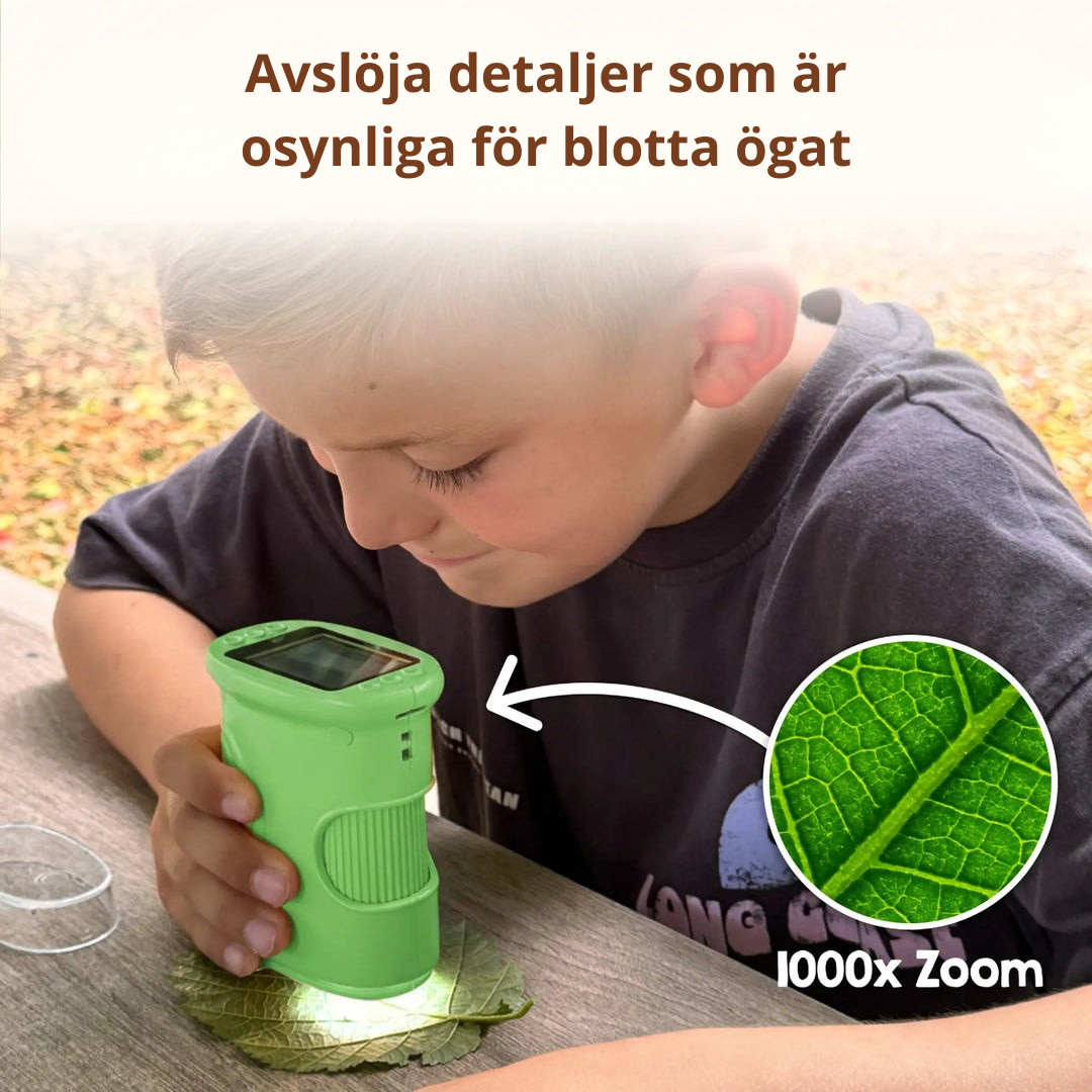 Det digitala mikroskopet öppnar en helt ny värld som annars är osynlig för blotta ögat. Cellstrukturer, insektsögon eller bladens fina mönster blir plötsligt tydliga. Med upp till 1000× förstoring får barnet en äkta wow-effekt. Ditt barn blir fascinerat och kan fördjupa sig i timmar på egen hand. Det är en gåva som imponerar redan från första gången man tittar genom mikroskopet.
